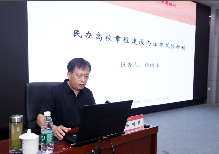 中原工学院法学院教授杨树林为学员们讲解了民办高校章程建设与法律风险控制。他从民办高校章程的制度逻辑、地位意义等方面介绍了民办高校章程的面相,阐述了民办高校章程制定中的“政治过关、程序合法、要素齐全、内容规范”等基本要求、必要条款等,指出章程应当解决的问题,分析了民办高校治理中所面临的风险及其产生原因、风险控制方式等。